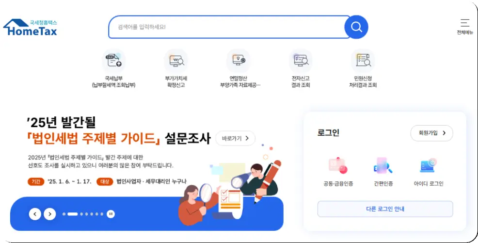 세금 업무를 더 쉽게 처리하고 싶으신가요? 국세청 홈택스를 이용해 보세요! 세무서를 방문할 필요 없이 세금 신고, 납부, 민원 증명 발급은 물론, 연말정산 간소화 서비스까지 모두 해결할 수 있답니다.